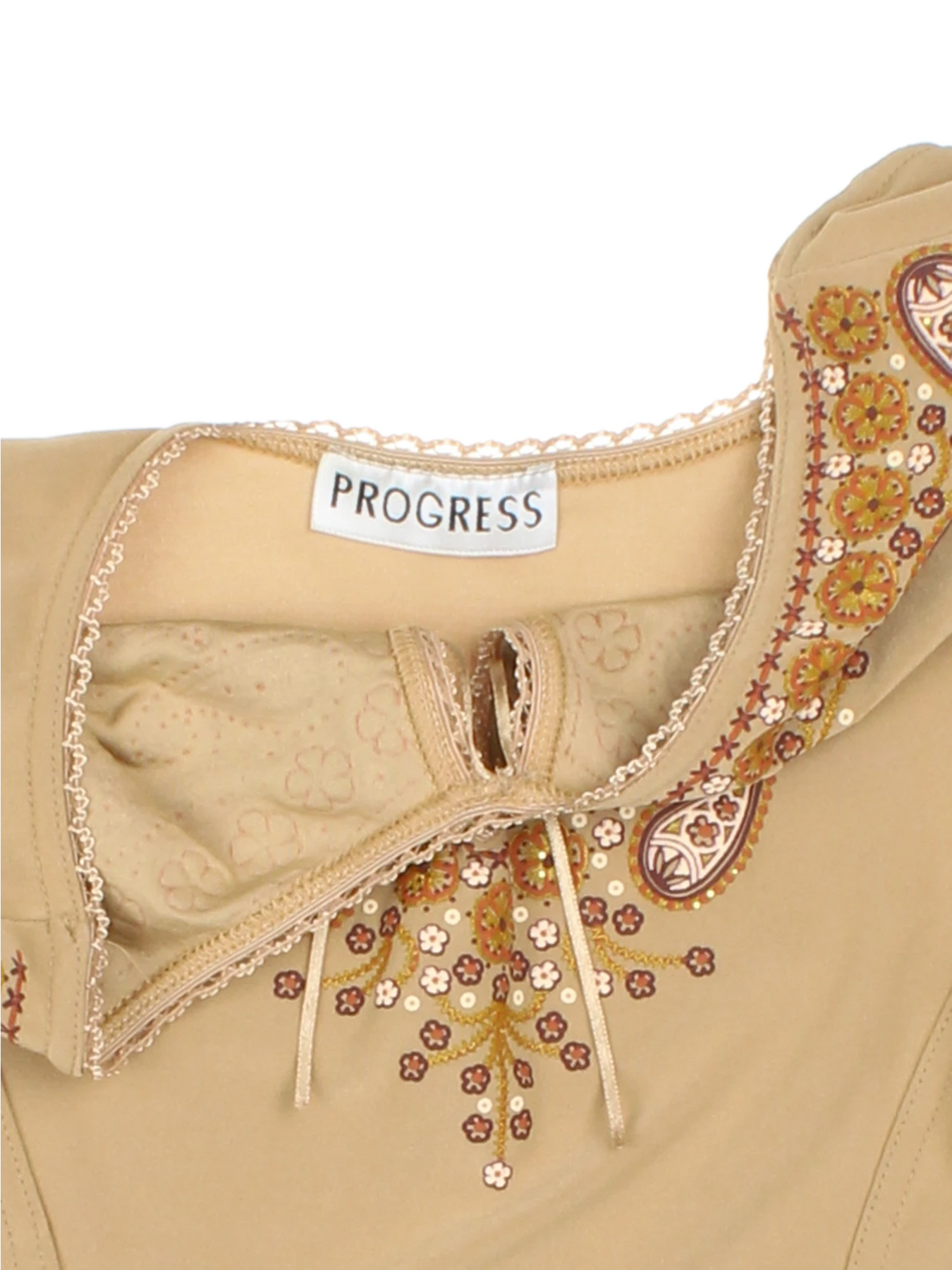Experience vintage-inspired chic with the Progress Y2K Beige Paisley Flared Sleeve Women's Top, size XXS. This top features unique flared sleeves and exquisite paisley floral detailing across the neckline and sleeves, capturing a retro yet timeless aesthetic. Crafted from quality polyester, it provides a comfortable, slightly stretchy fit perfect for both casual and statement looks. The light tan beige base is beautifully accented with warm earth-toned embroidery, making it an ideal piece for day-to-night styling. Wear it with high-waisted flares or a vintage skirt. Upgrade your wardrobe and express your individual style with this standout piece, perfect for lovers of retro fashion and unique apparel collections.