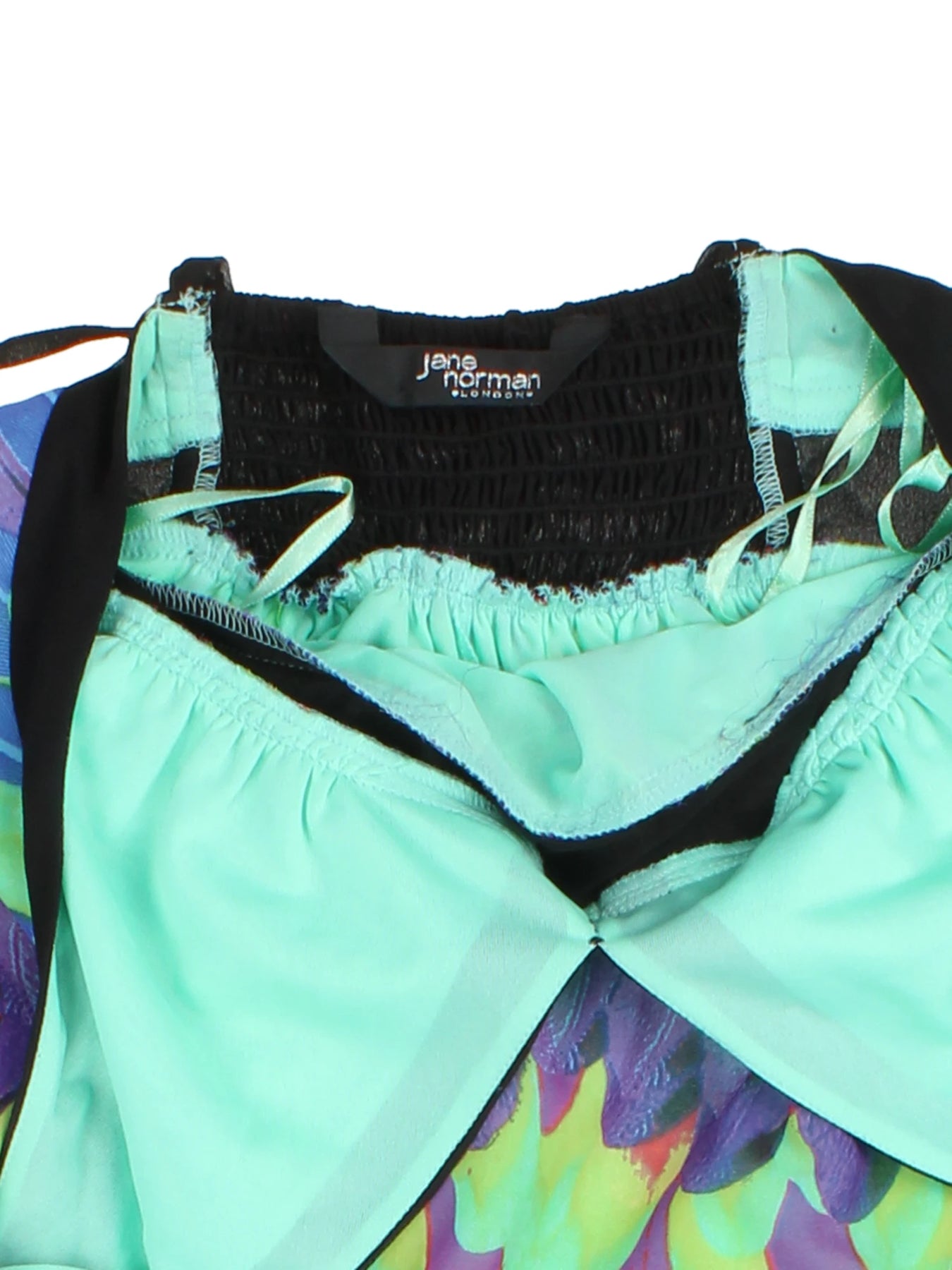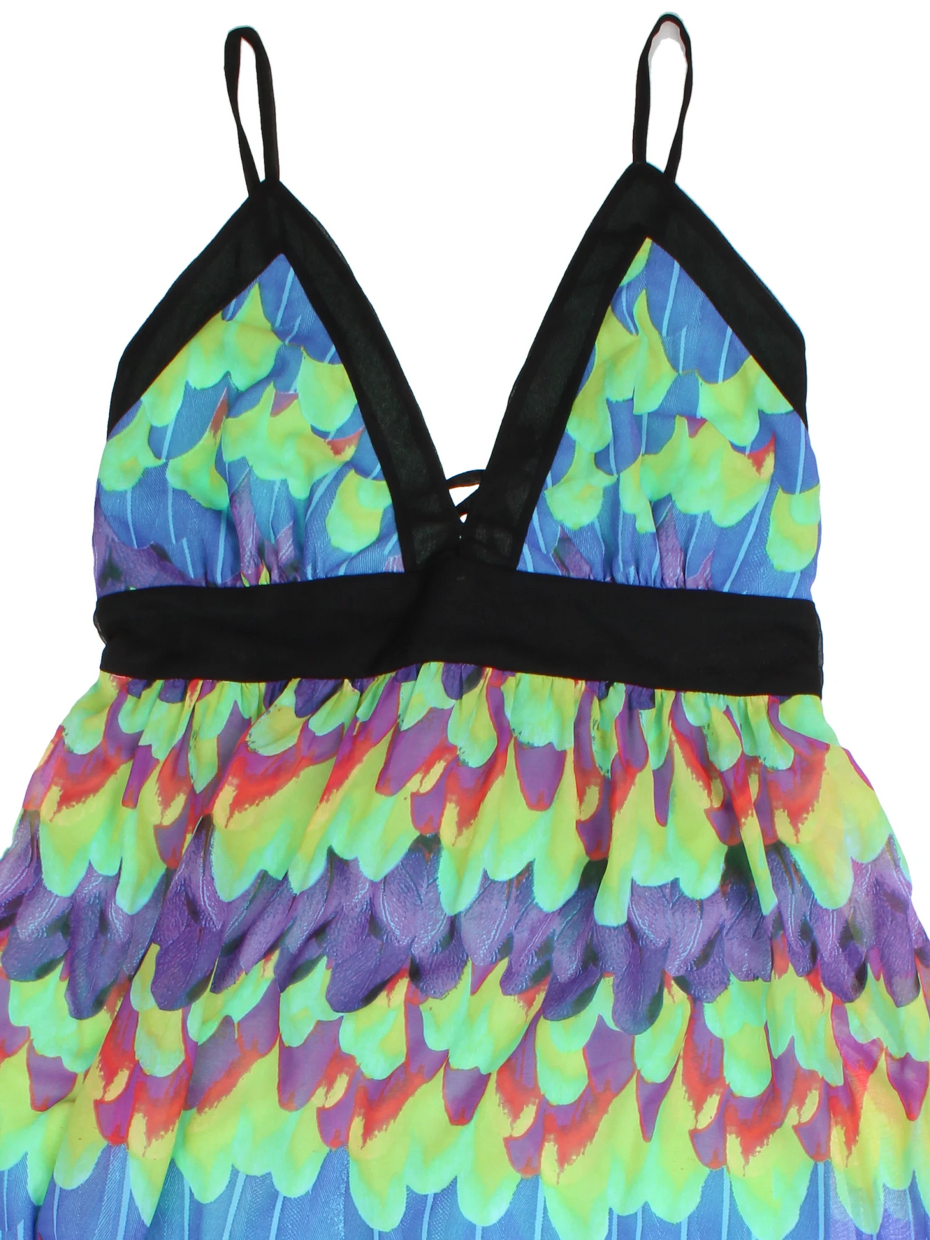 Stand out with the Jane Norman London Multicoloured Maxi Dress, designed for women who love to embrace bold style. This eye-catching dress features striking multicoloured feather-like prints in blue, green, yellow, and purple hues, promising effortless vibrancy on any occasion. Crafted from high-quality polyester, it offers a light and breezy fit with beautiful flow. The strappy detail and deep v-neck add a hint of glamour while the gathered waist ensures a flattering silhouette for size XXS. Ideal for parties, outings, or daytime events, this Jane Norman dress pairs perfectly with sandals for a chic summer vibe. Make a statement and elevate your wardrobe with this unique maxi dress, a must-have piece for the season.