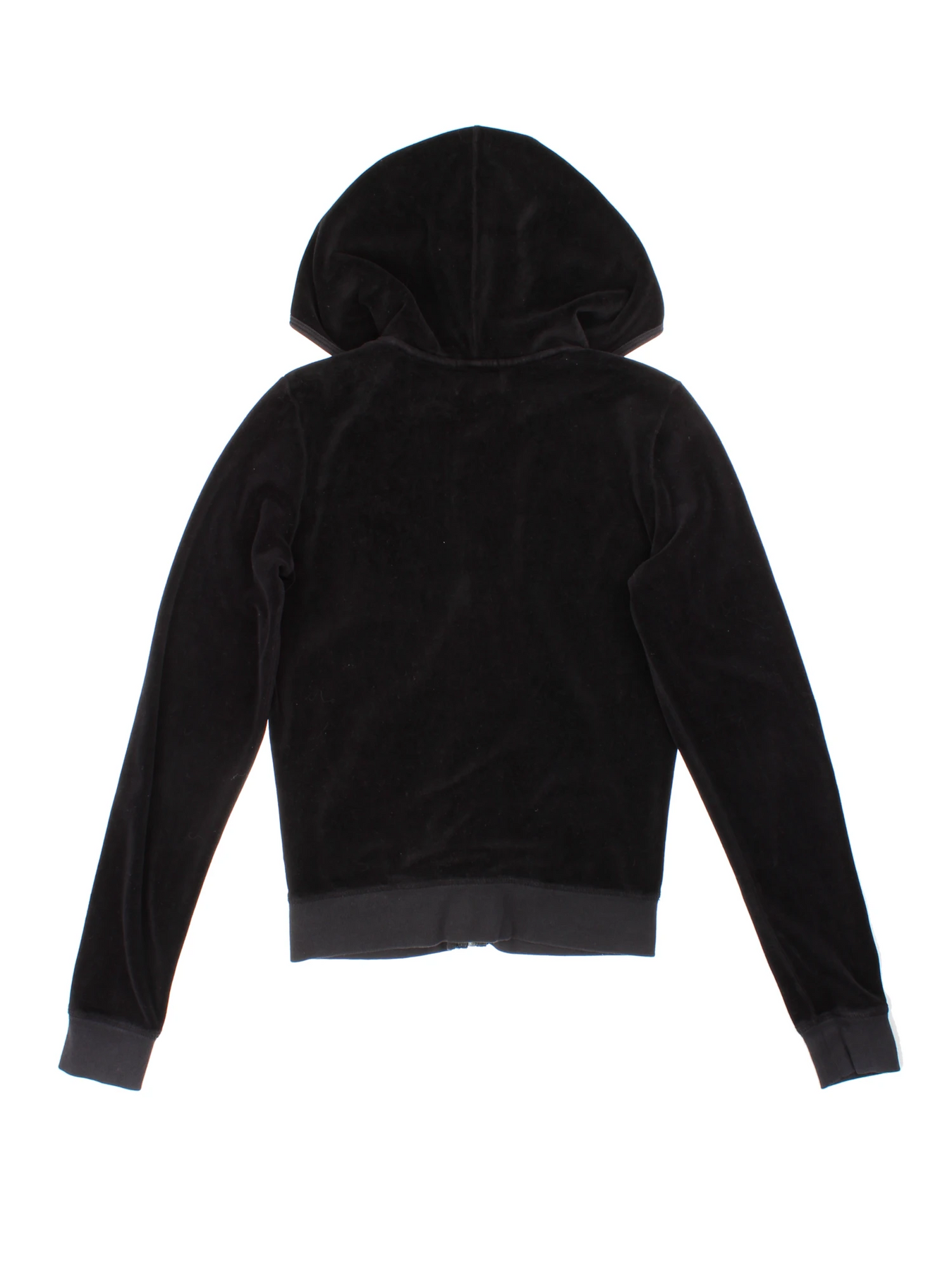 Step up your style game with this iconic Juicy Couture Women’s Black Velour Zip Hoodie Jacket in a classic Y2K style, designed to exude effortless luxury and nostalgia. Crafted from premium velvet for a plush and soft feel, this jacket provides a relaxed fit that is perfect for layering on breezy days or adding a statement piece to your casual wardrobe. The standout crystal-embellished 'Juicy' logo at the front and deep black hue create a bold look, while the size XXS cut ensures a flattering silhouette for everyday wear. Pair it with matching velour trousers or jeans for the ultimate Y2K revival, making it a must-have for collectors and contemporary trendsetters alike.