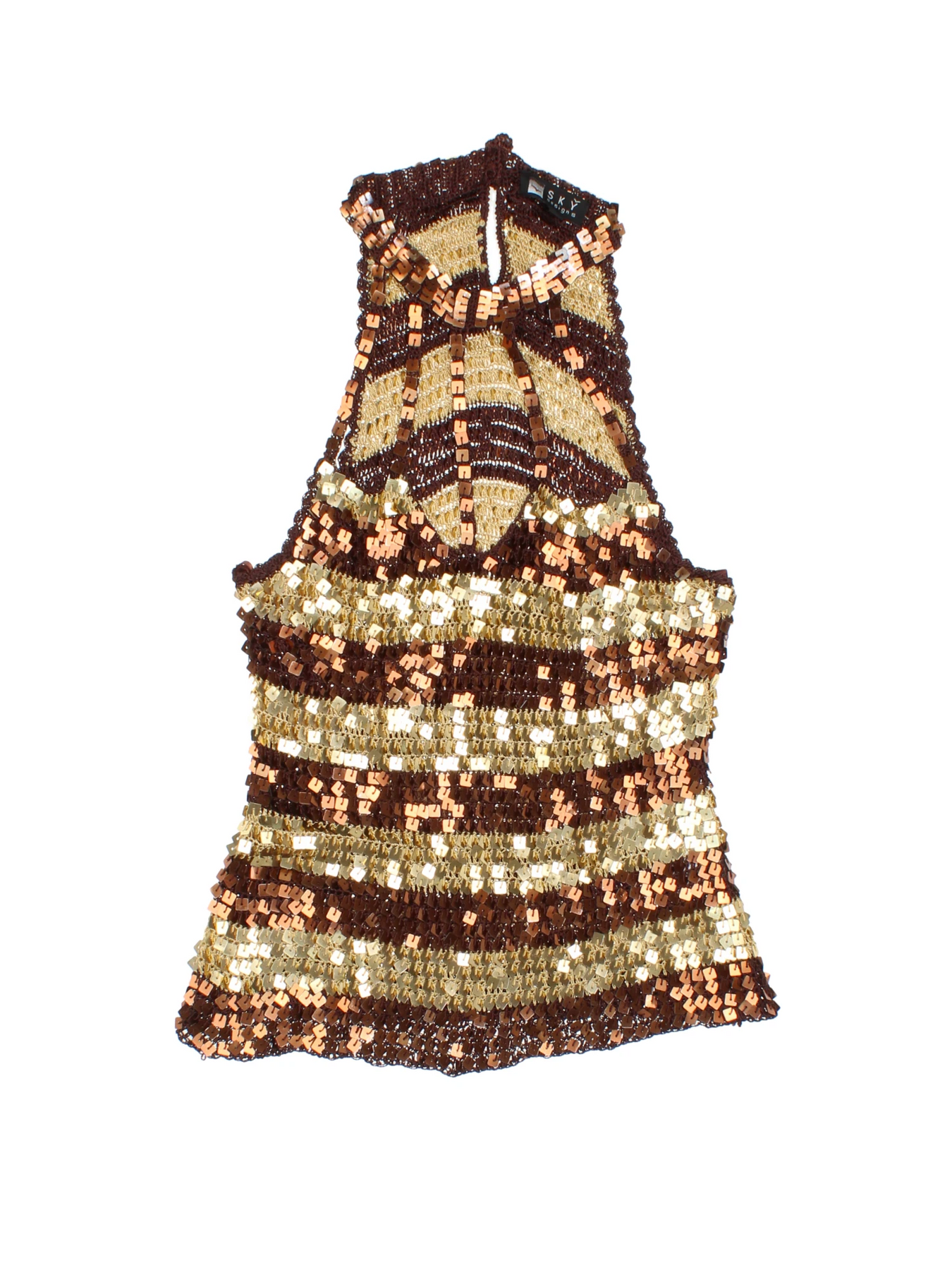 Make a statement at your next evening out with this enchanting Vintage SKY DESIGN Brown Gold Sequin Halter Top, crafted in a shimmering knit for a classic Y2K party vibe. This women's top features a bold halter neck and is adorned with sparkling brown and gold sequins that reflect light beautifully, adding instant glamour to any party look. The fitted size XXS cut offers a flattering silhouette, ideal for accentuating your figure while ensuring comfortable wear through the night. Perfect for club nights, special occasions, or festivals, this knitwear piece pairs effortlessly with jeans, skirts, or trousers for a signature Y2K look. Add this standout style to your collection and get ready to turn heads on the dancefloor.