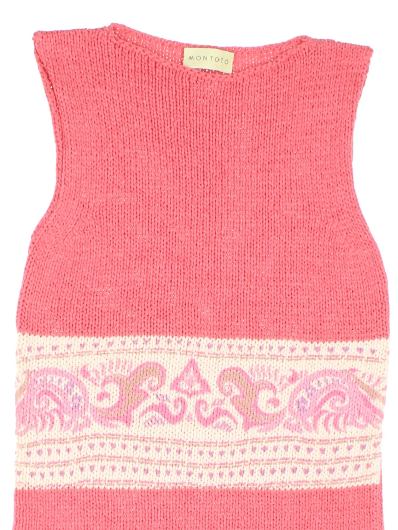 Step into the retro-inspired trend with this Montoto Pink Knitted Sleeveless Vest. This top features a striking patterned panel across the midsection, adding visual interest to the soft pink base. Made from cosy acrylic, the vest provides a gentle stretch and a lightweight feel, perfect for layering over shirts or wearing alone. This unique piece offers the charm of yesteryear with the practicality needed for modern daily wear. Pair it with high-waisted jeans or skirts for a playful, vintage-inspired look that transitions seamlessly from day to night.