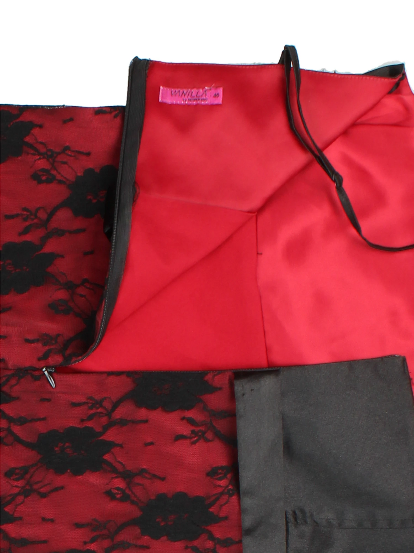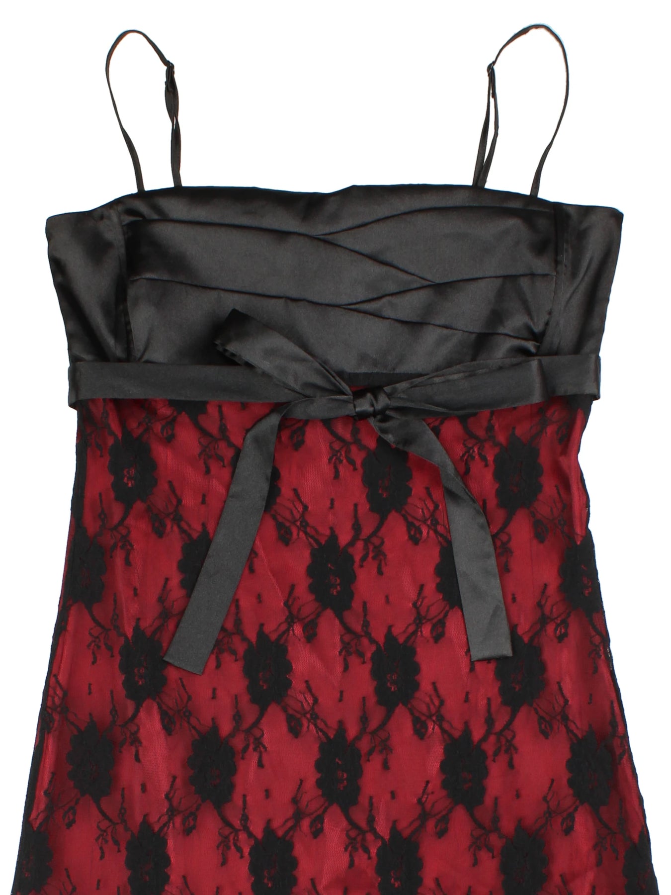 Elevate your occasion wardrobe with this stunning Vintage Women’s Black Lace Overlay Red Satin Midi Dress, designed to exude timeless sophistication and allure. Featuring a gorgeous deep red satin foundation adorned with elegant black floral lace, this dress offers a beautiful contrast that catches the eye at every angle. Its tailored silhouette includes delicate adjustable spaghetti straps and a chic black waistband bow detail, creating a flattering shape perfect for formal parties, festive celebrations, or special evenings out. Pair it with your favourite heels and a clutch for an unforgettable ensemble that guarantees compliments wherever you go.