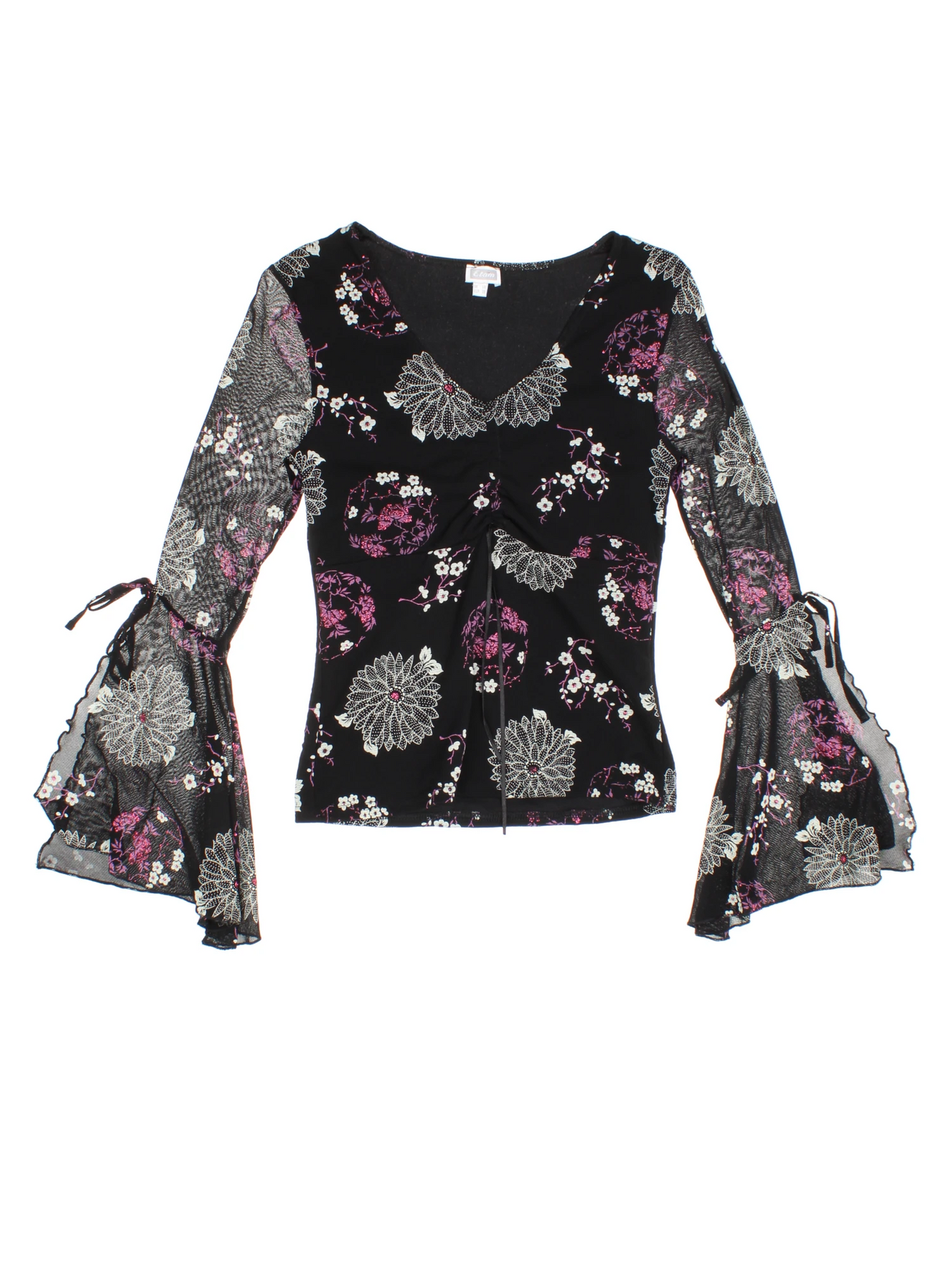 Step into the elegance of vintage fashion with this Etam Black Floral Mesh Bell Sleeve Top, designed in a classic Y2K style for women who appreciate statement pieces. Crafted from lightweight polyester, this top features a delicate all-over floral print with hints of purple and white, and standout flared mesh sleeves for a dramatic flourish. The flattering XXS size ensures easy wearability, making it the perfect choice for parties, casual outings or evening events. Pair with jeans or a skirt for a versatile look that exudes retro-chic sophistication and timeless appeal.
