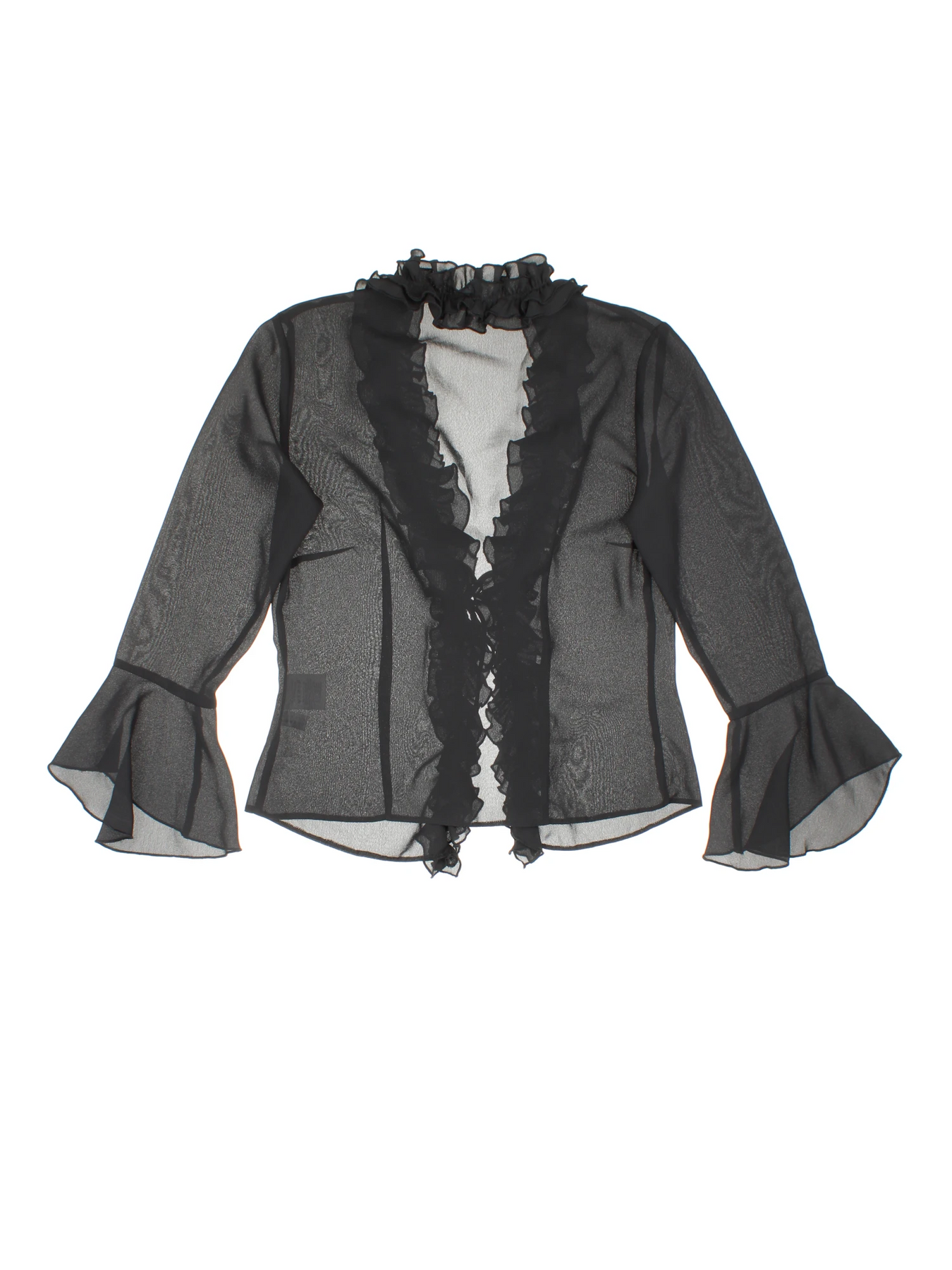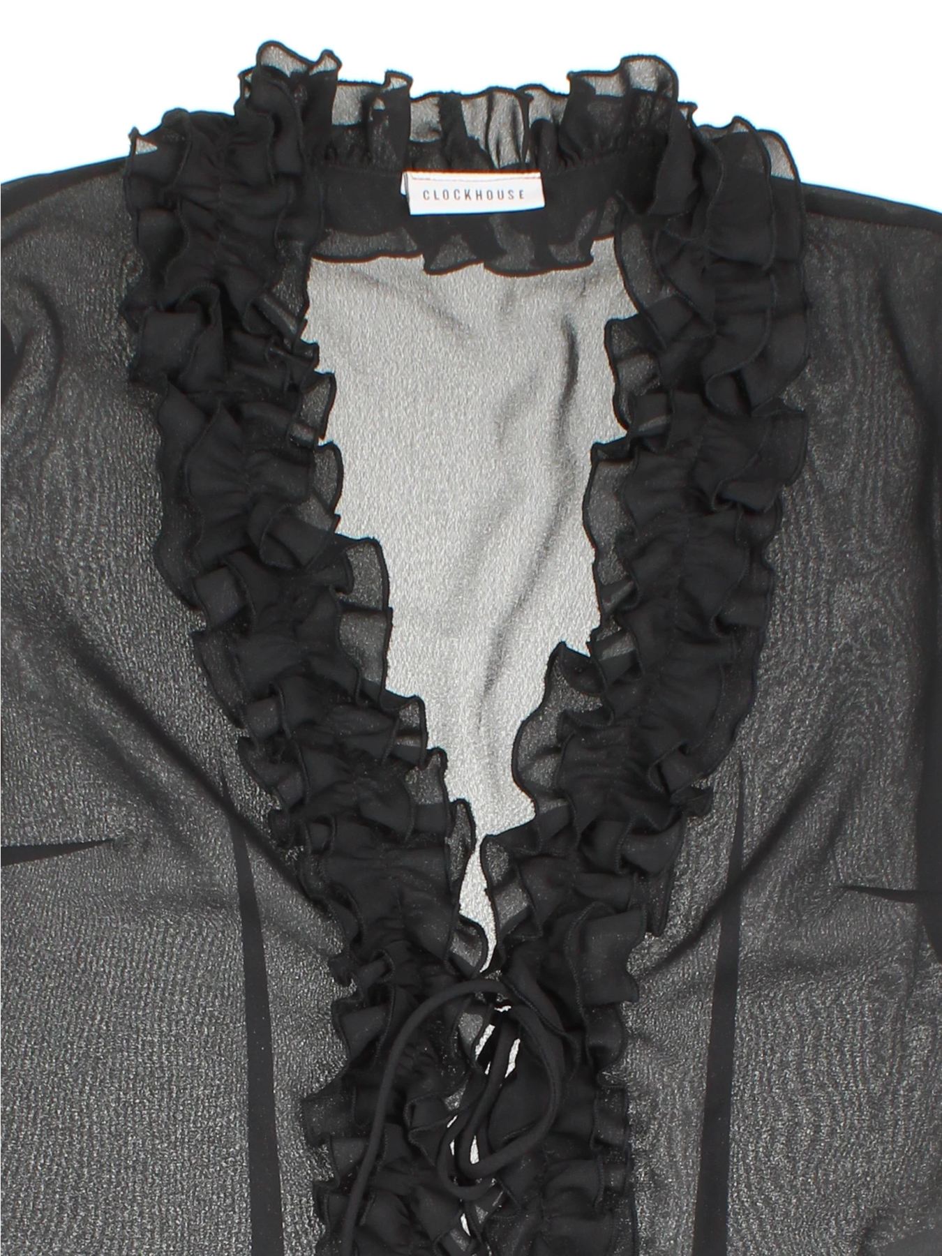 Step into statement chic with the Clockhouse Women's Black Sheer Ruffle Blouse Top, crafted in quality polyester for a lightweight, breezy feel. This Y2K-inspired blouse features dramatic ruffle detailing along the neckline and front, paired with stylish flared sleeves that channel timeless retro vibes. The sheer mesh fabric adds a modern twist, perfect for layering over camisoles or bralettes for bold, fashion-forward looks. Tailored in a size S for a flattering fit, this piece is ideal for women seeking a standout addition to their wardrobe. Pair with jeans or skirts for nights out, special occasions, or when you simply want to turn heads. This eye-catching blouse is a versatile must-have for lovers of vintage and Y2K clothing style, promising endless styling possibilities for your next event.