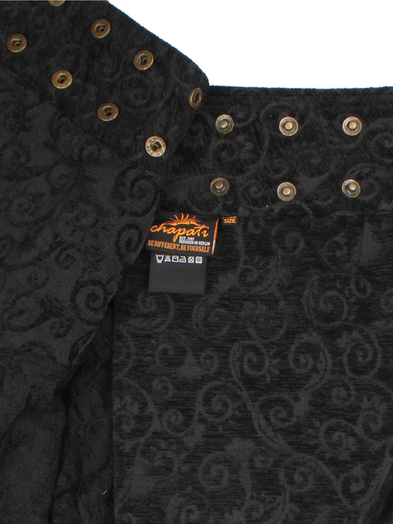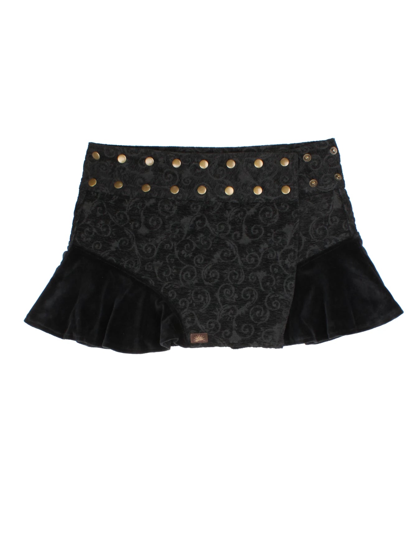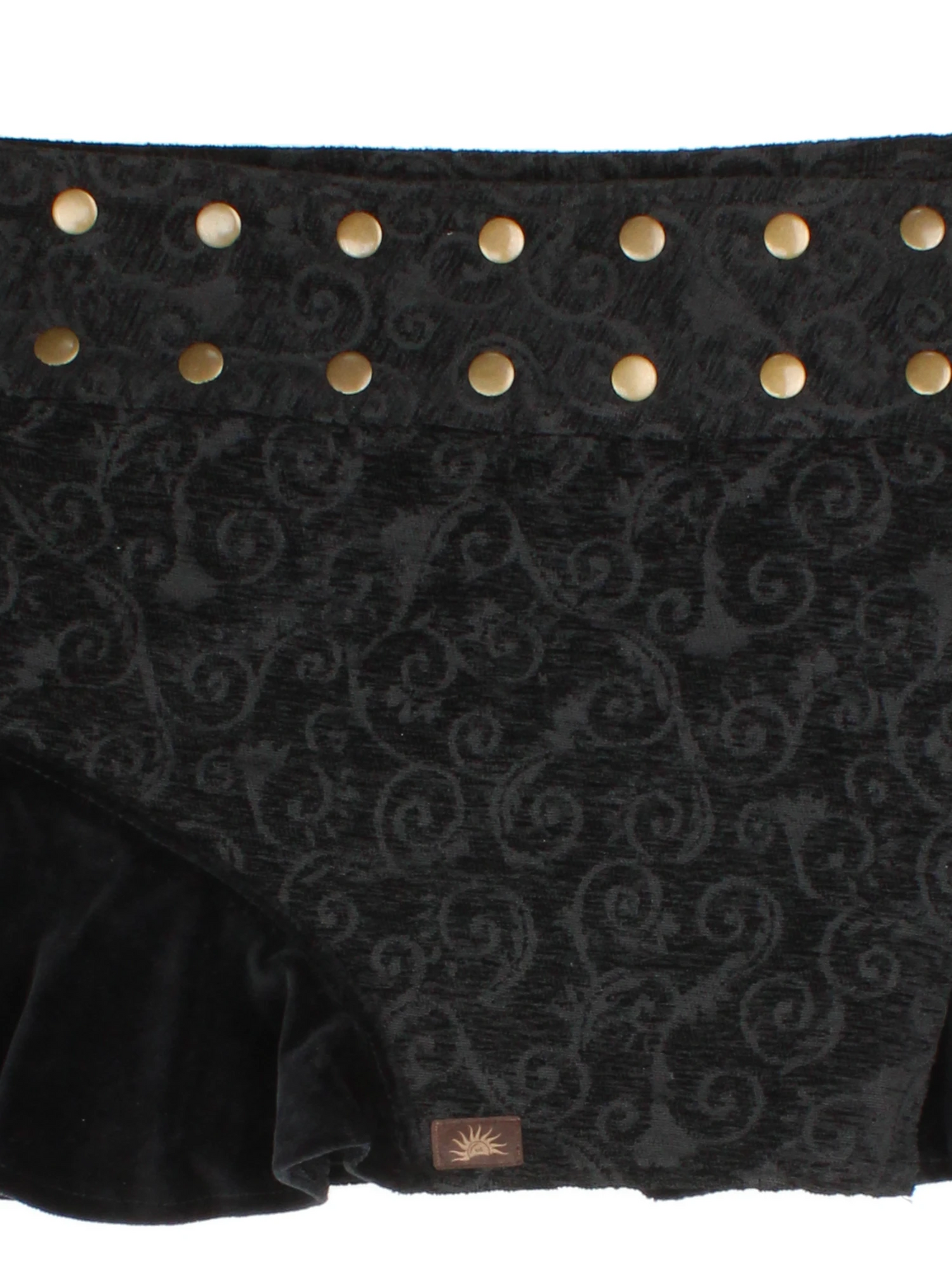 Step out in style with the enchanting Chapati Black Velvet Mini Skirt, featuring unique gold stud detailing and a textured swirl patterned waistband. Crafted from soft velvet, this mini skirt offers a comfortable fit with elegant ruffled hem, perfect for embracing party season or elevating your casual looks with a touch of 00's Y2K flair. Available in a versatile black hue and flattering women’s size L, it's ideal for evenings out, festive events, or making a statement at any daytime gathering. Pair it with boots and a fitted top for chic, fashion-forward energy that invites compliments and confidence.