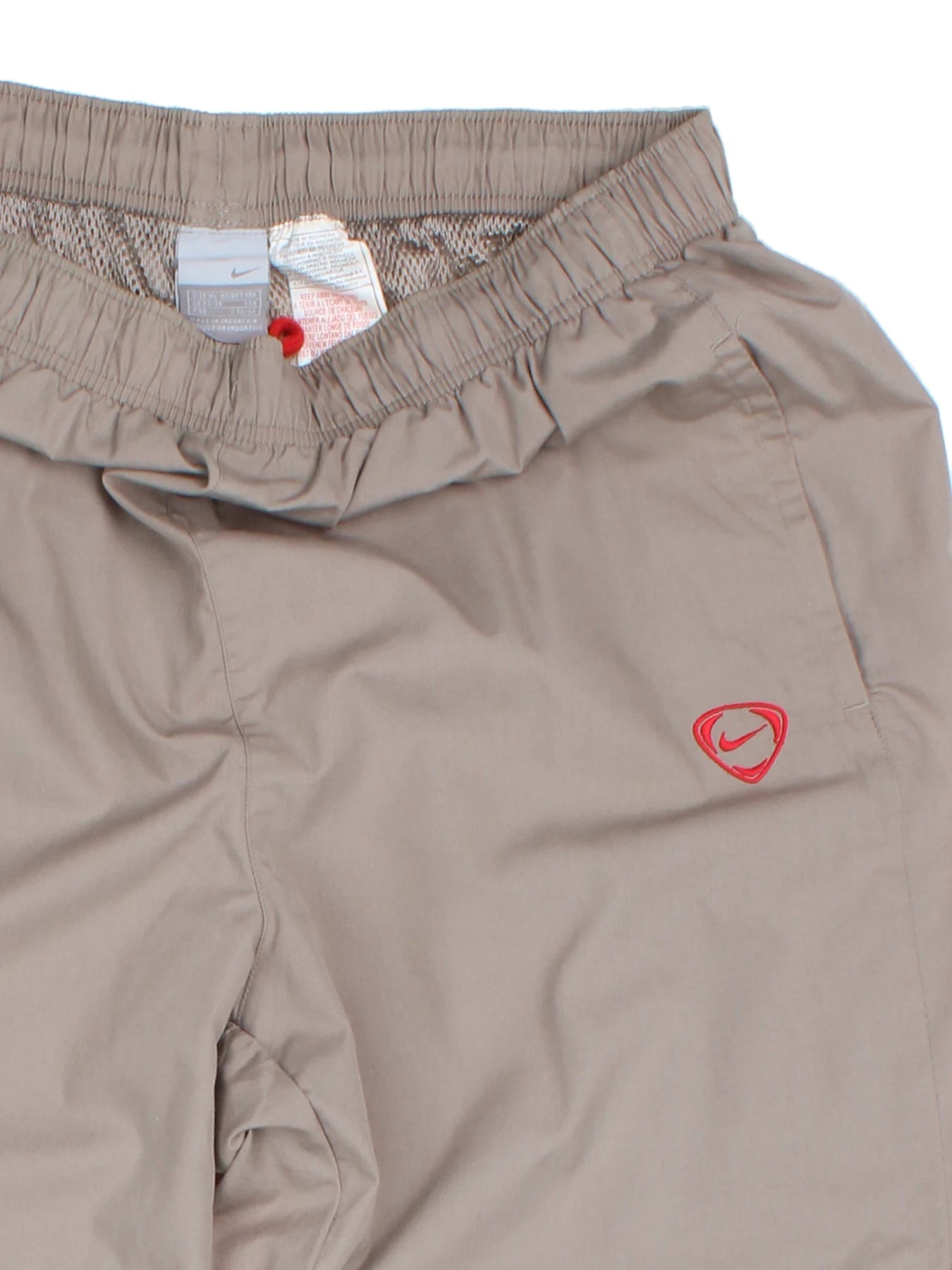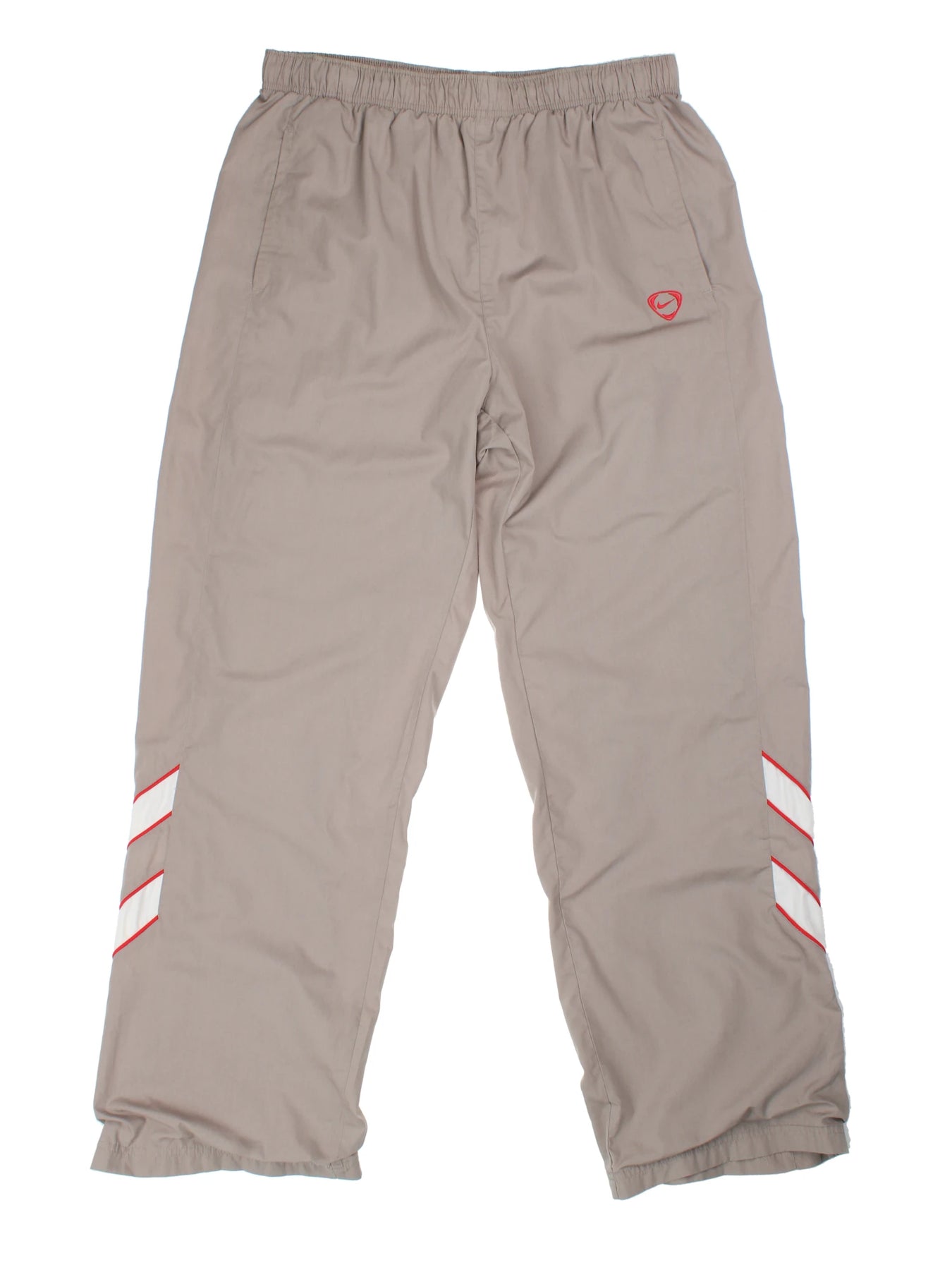 Step up your athleisure game with these Nike Taupe Polyamide Track Trousers in size XL, a true vintage Y2K statement piece. Crafted from lightweight and durable polyamide, these trousers ensure a comfortable wear for workouts or casual outings. The classic beige colour accented with bold red and white stripe details along the lower legs and the iconic embroidered Nike logo bring iconic 2000s sports style to any wardrobe. The elasticated waist provides an adaptable fit while side and back pockets offer practicality. Perfect for football, sports, or streetwear, these Nike trousers are an essential addition to any vintage clothing collection. Pair them with your favourite trainers or a vintage Nike tee for a standout, retro-inspired look.