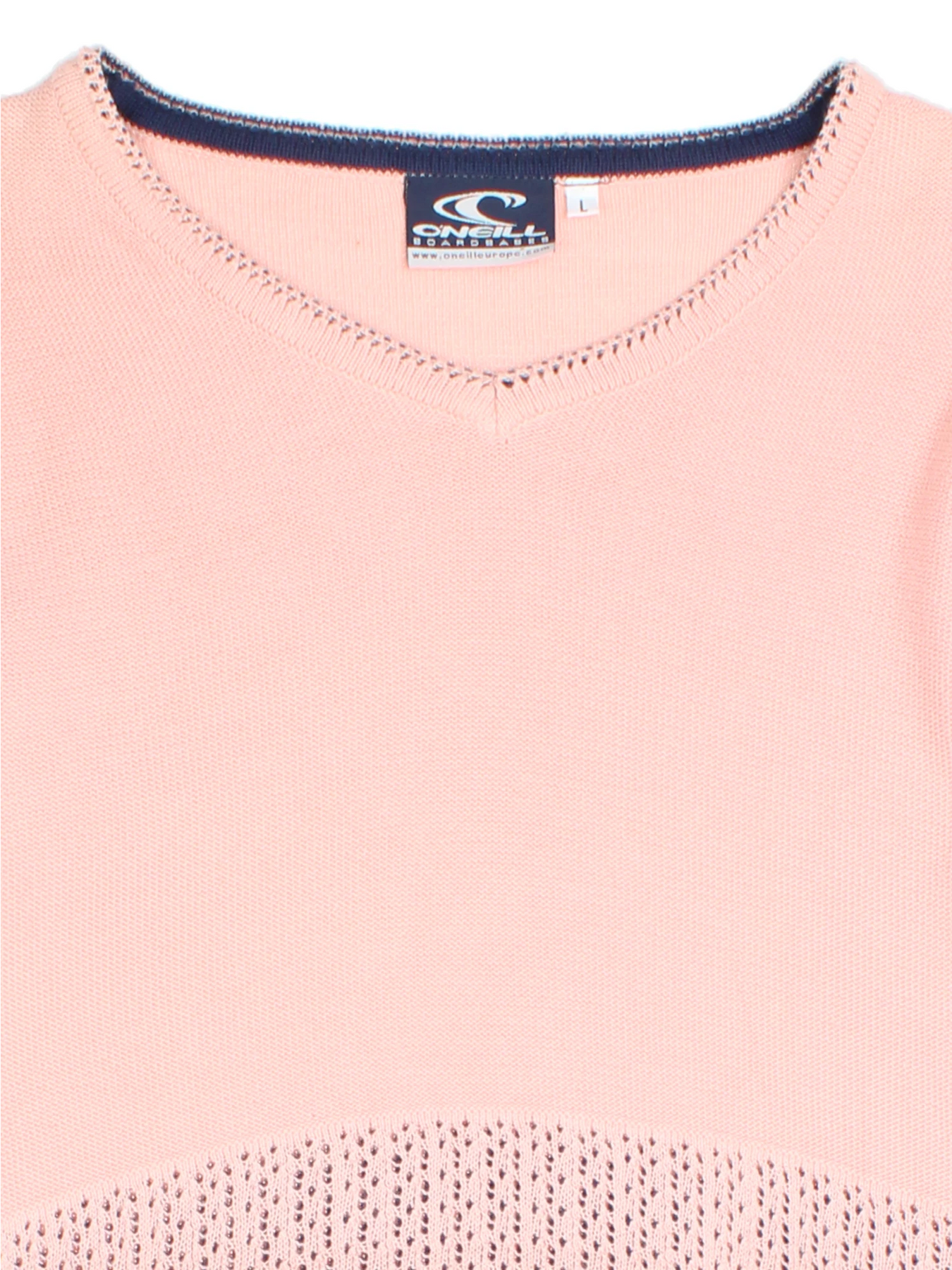 Refresh your wardrobe with this effortlessly stylish O'Neill Pink Cotton V-Neck Jumper, designed for women who appreciate both comfort and chic retro flair. Crafted from soft, breathable cotton, this jumper is perfect for everyday casual wear and offers a classic Y2K inspired look. The delicate pink hue, accented with navy stripes on the sleeves and hem, adds a pop of playful colour while the intricate knit panel at the bottom enhances texture and style. The large fit ensures comfort and ease of movement, making this jumper ideal for layering on cooler days or as a statement piece for casual outings. Pair with jeans or skirts for versatile styling options to suit any occasion.