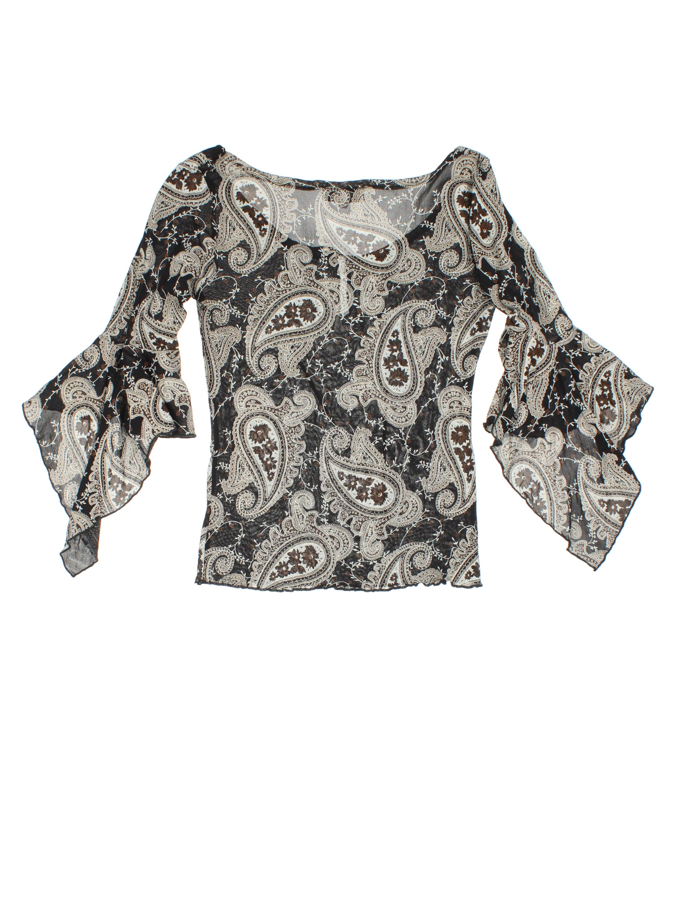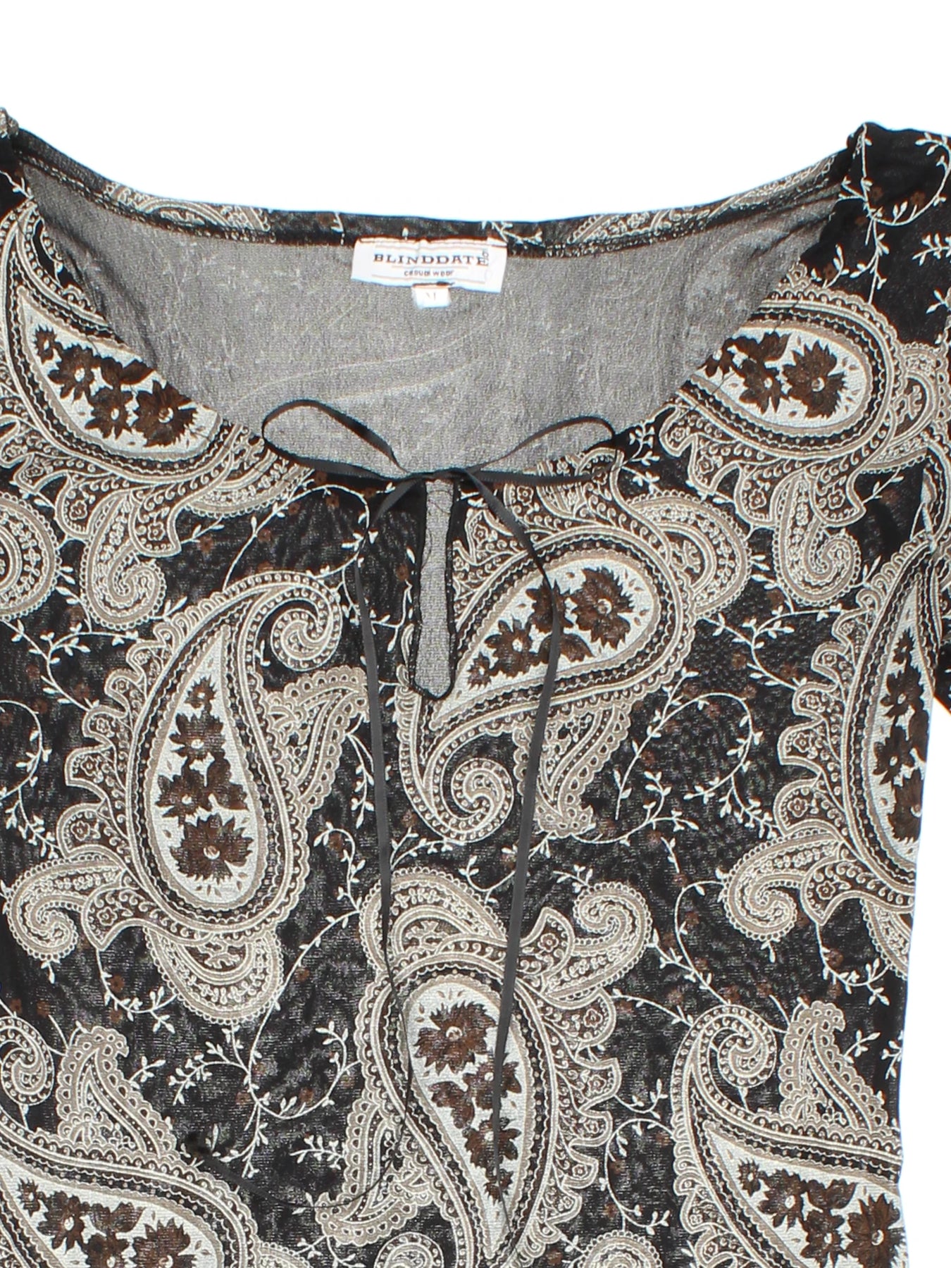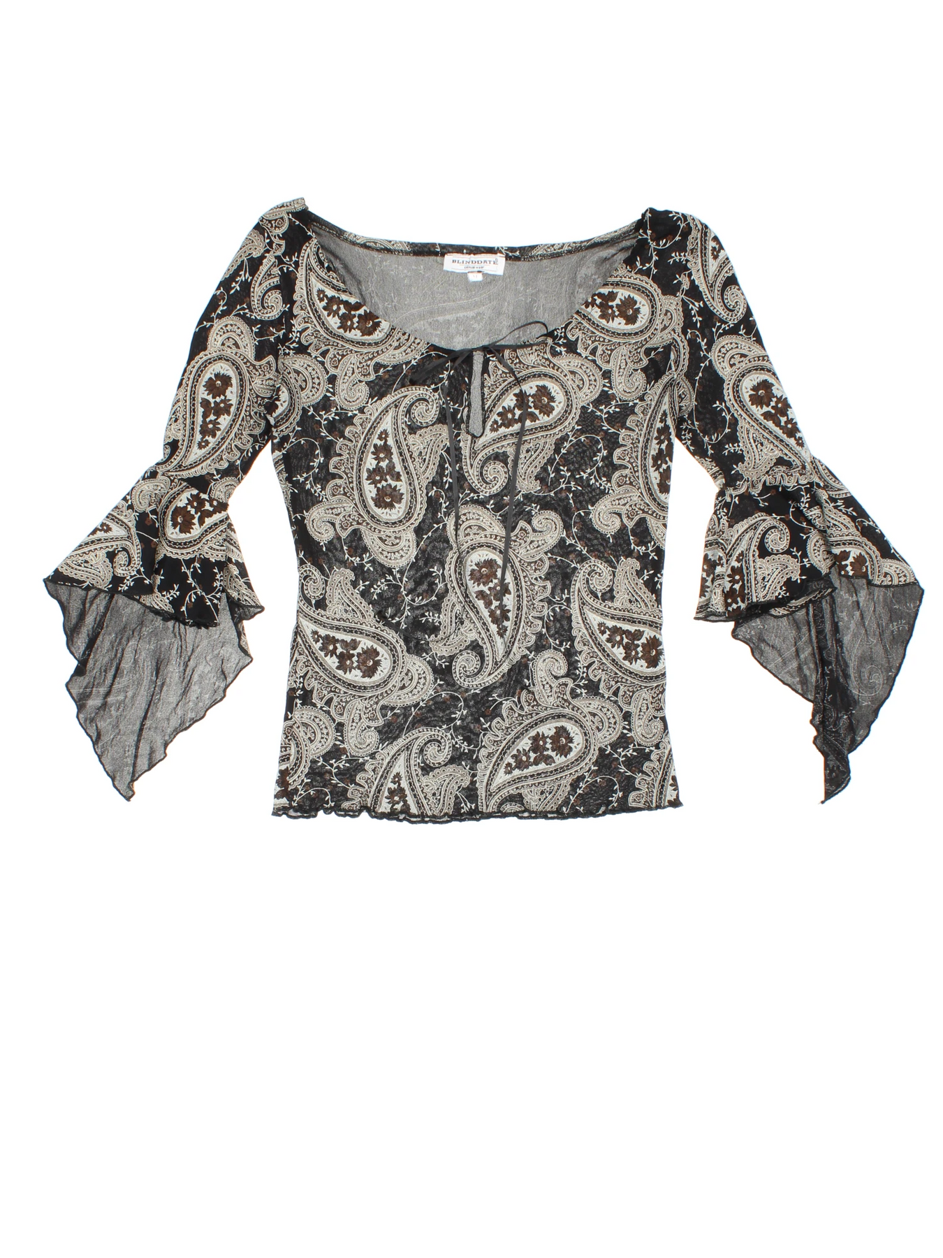 Step into vintage style with this Blind Date Black Paisley Flared Sleeve Sheer Top, designed to make a statement in any wardrobe. Featuring a classic paisley print in neutral black, brown, and cream tones, this top captures the bold energy of the 90s and Y2K eras. The flared angel sleeves add a dramatic flair and flow, perfect for making an impression on nights out or casual gatherings. Crafted from lightweight polyester, this women’s size XS blouse ensures breathability and comfort, while its sheer finish delivers a chic look ideal for layering. Pair it with jeans or skirts for an effortless transition from day to evening, embracing retro-inspired fashion with a modern twist.