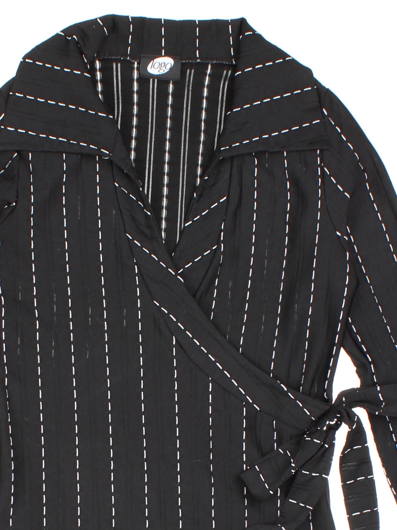 Embrace timeless sophistication with this Vintage Black Striped Cotton Wrap Blazer Top in women's size XS, reflecting iconic Y2K style. Crafted from breathable cotton, this wrap top features a chic black base with distinctive white pinstripe detail and a flattering waist tie. The long sleeves with stylish cuff details add a structured, elegant silhouette, making it a versatile choice for both casual and smart occasions. The lightweight cotton fabric ensures ultimate comfort for all-day wear, while its tailored fit highlights your figure in the most graceful way. Ideal for work, evenings out, or layered for a polished day look. Pair with trousers, skirts, or denim to elevate any wardrobe instantly.