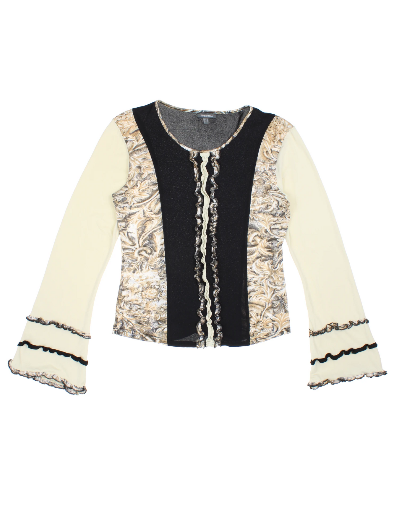 Step into standout vintage style with this Street One Retro Patterned Long Sleeve Top in a stunning combination of cream and black hues. Designed to channel the bold energy of the 70’s and Y2K fashion eras, this women’s blouse flaunts flared sleeves with ruffled accents for a true statement look. Crafted from soft polyester, it’s lightweight and comfortable for day-to-night wear. The artistic swirls and flattering size XXS fit make it perfect for adding flair to any outfit. Dress it up with high-waisted trousers or keep it relaxed with your favourite denim. Ideal for lovers of vintage and retro aesthetics, this top will elevate your wardrobe with its unique design and striking silhouette.