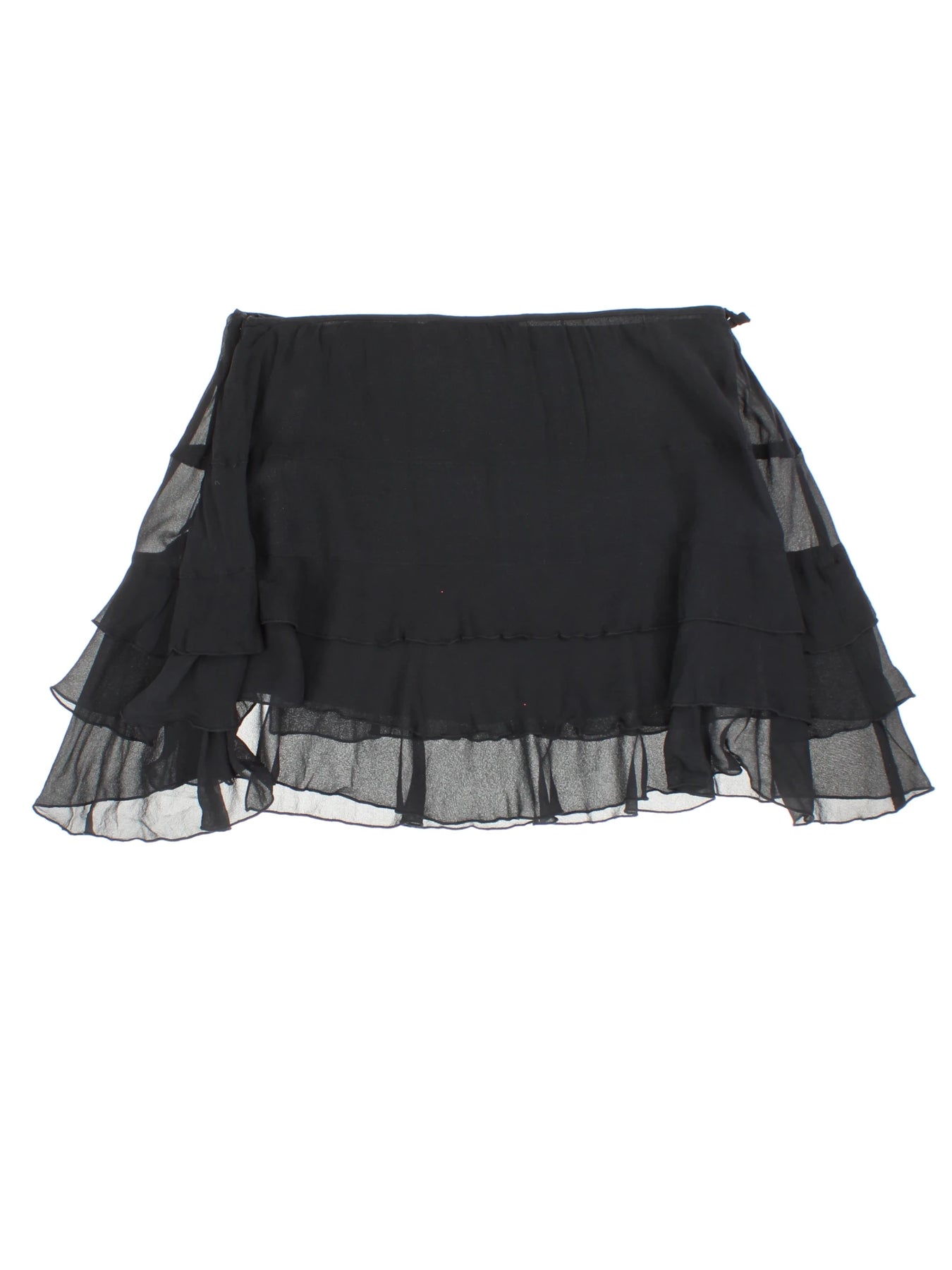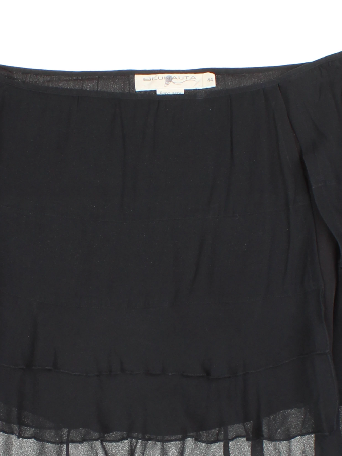 Elevate your wardrobe with the sophisticated Bluenauta Black Silk Ruffle Mini Skirt in size L, perfect for embracing timeless 00’s elegance. This enchanting skirt, crafted from pure silk, features delicately layered ruffles that enhance its feminine flair and offer graceful movement with every step. The ultra-lightweight, breathable silk ensures comfortable wear for parties, nights out, or special occasions. With its sleek black colour and mini silhouette, this piece flatters a range of body types, making it an essential for any fashion-forward woman’s collection. Pair it effortlessly with blouses or fitted tops and your favourite heels for a head-turning ensemble.