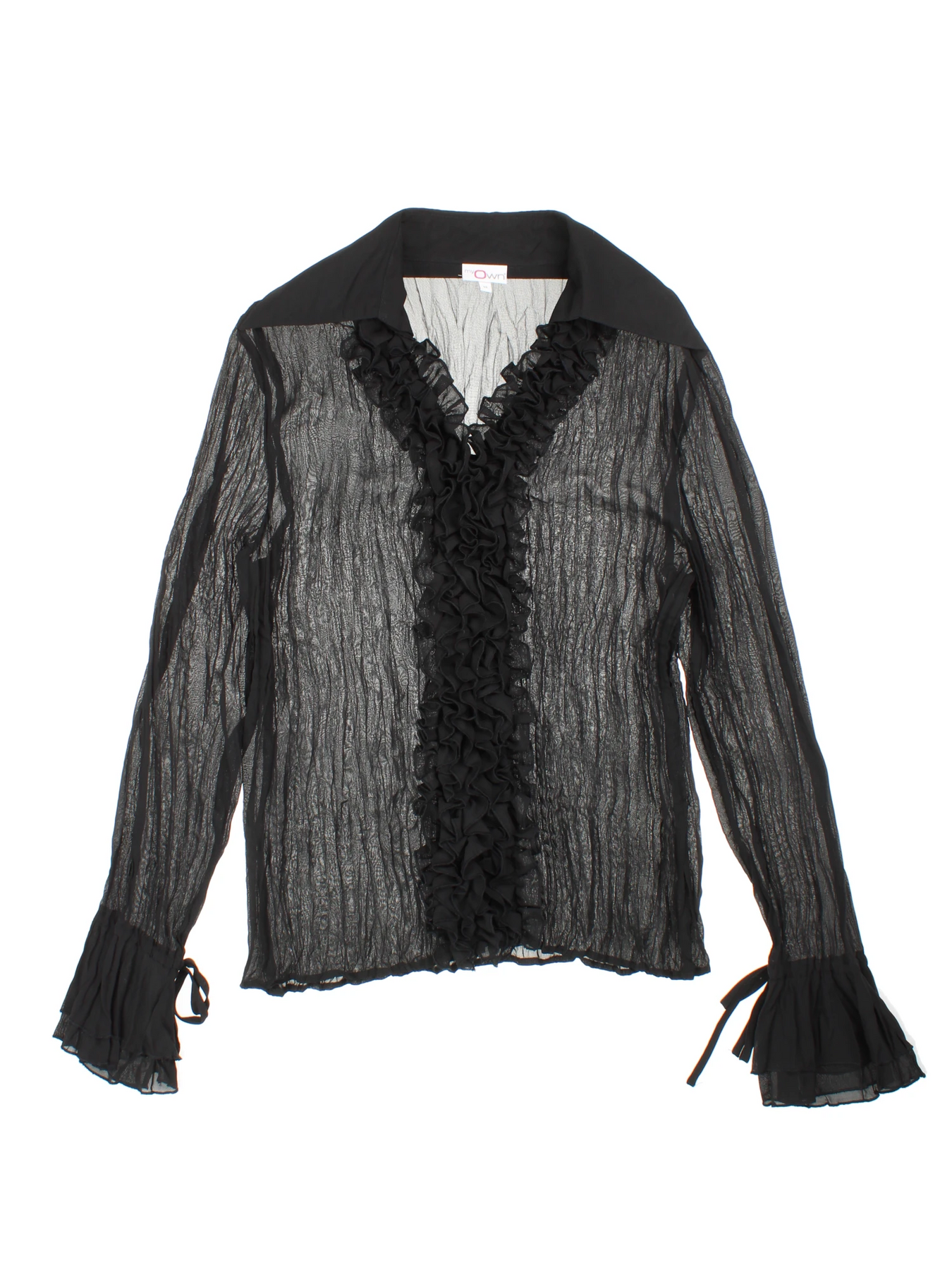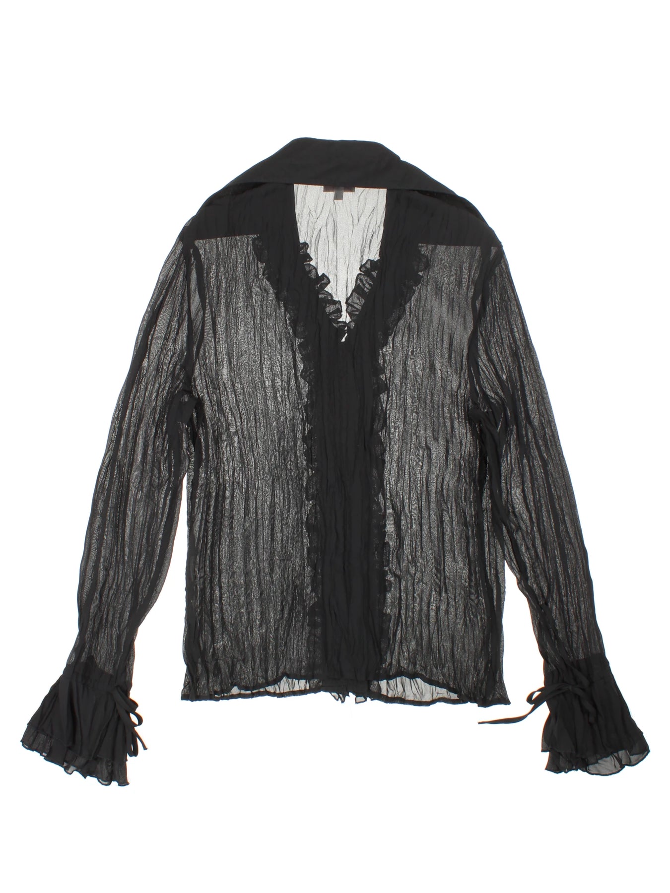 Step into the spotlight with this eye-catching My Own Black Sheer Ruffle Blouse, designed in a women’s medium for a classic fit that celebrates the allure of the Y2K style. The blouse features delicate ruffled detailing along the front and flared sleeves with tie accents, creating a dramatic yet refined silhouette ideal for evenings out or sophisticated daytime looks. Crafted from airy polyester, this vintage-inspired piece offers a lightweight, breathable touch and sheer finish, making it a wardrobe essential for layering over camisoles or wearing on its own for bold statement style. Pair this blouse with tailored trousers or high-waisted denim for a standout ensemble that effortlessly blends retro elegance with modern chic. Perfect for fashion-forward women who cherish unique and timeless pieces.