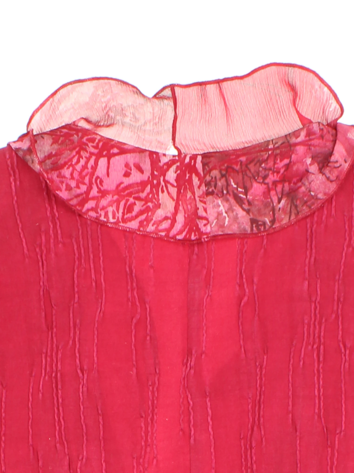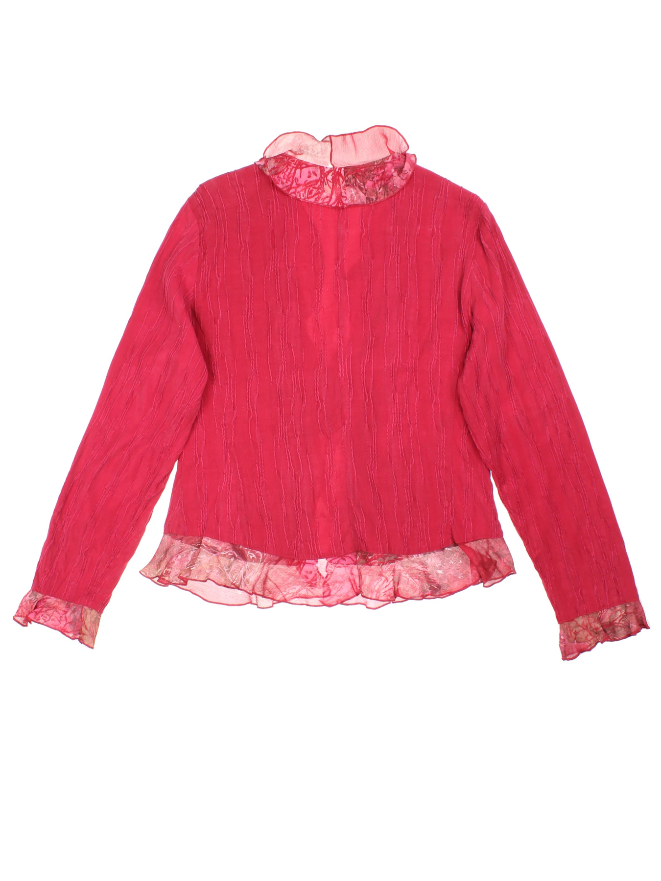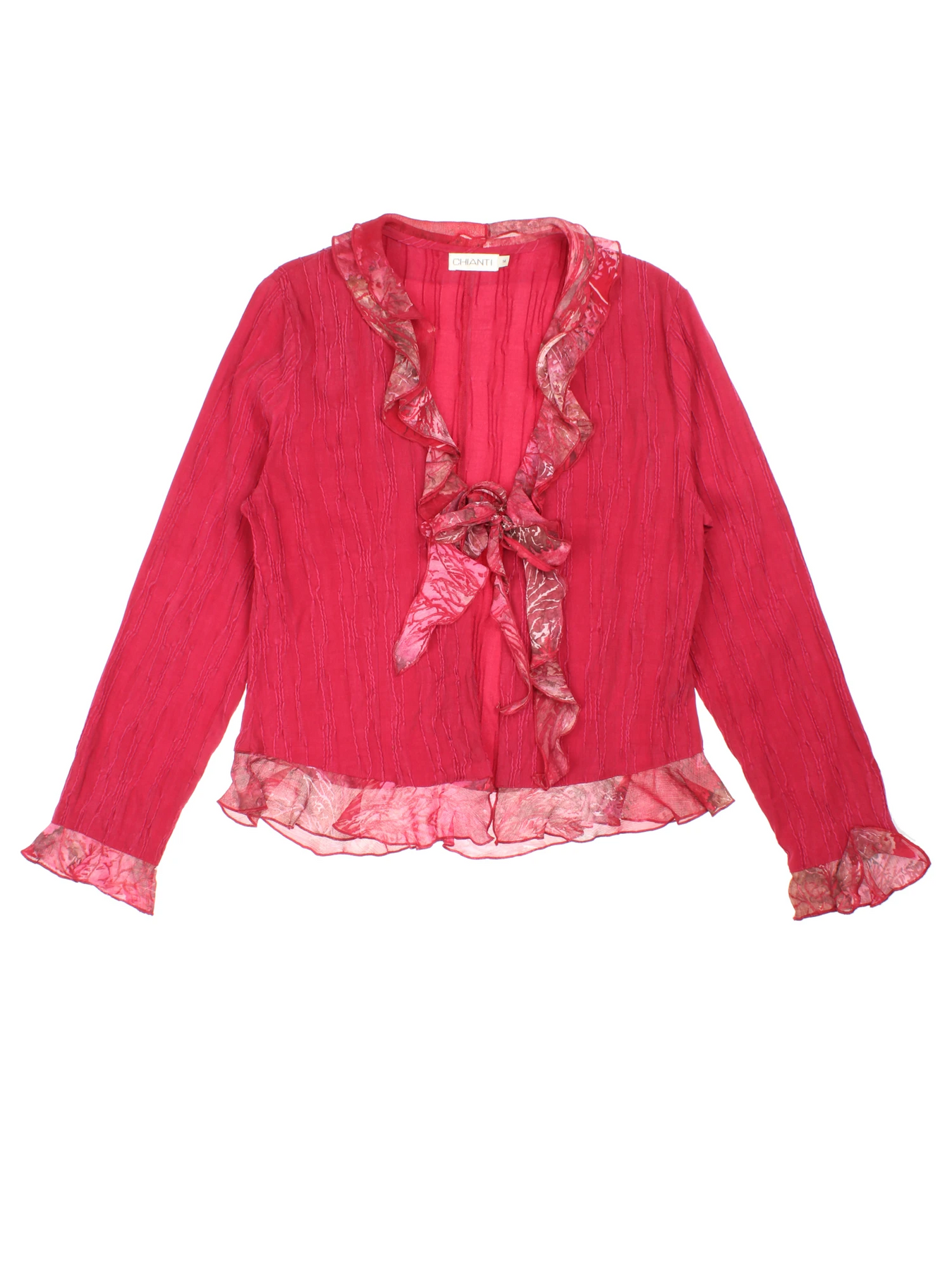 Bring a touch of vintage charm to your wardrobe with this Chianti Pink Sheer Ruffle Tie Up Blouse in a size M. Crafted from lightweight polyester, this blouse features playful ruffled trims along the neckline, cuffs, and hem, elevating the silhouette with feminine flair. The tie-up front detail adds a chic accent, perfect for both smart and casual outfits. Inspired by Y2K vintage style, the sheer pink fabric offers breathability and a delicate finish, ideal for layering over camisoles or bralettes. Designed for women seeking a bold yet graceful statement piece, this blouse effortlessly transitions from daywear to an evening out. Team with tailored trousers or your favourite denim for a stunning, versatile look.