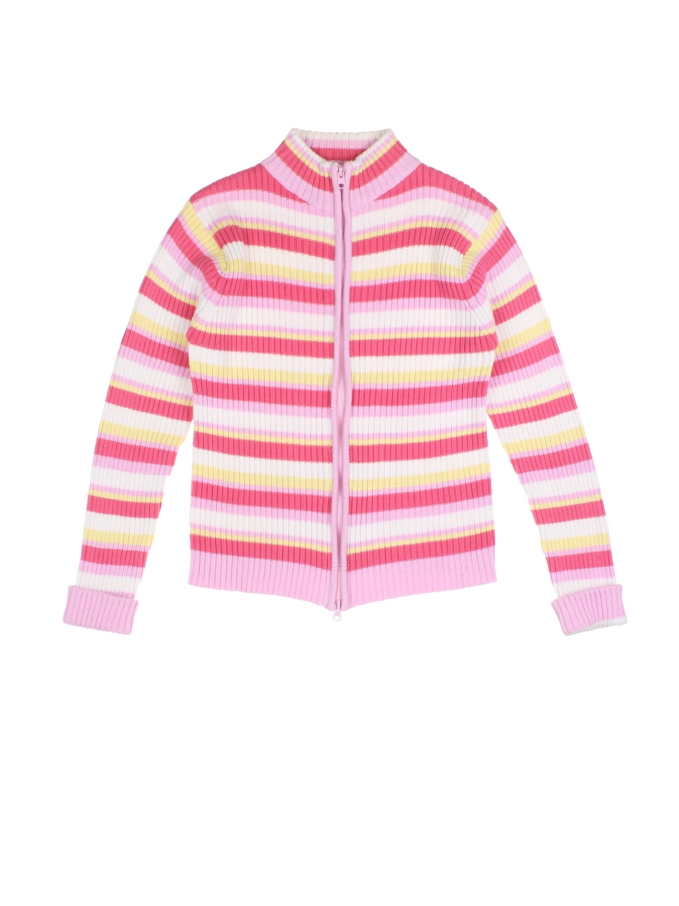 Brighten up your wardrobe with this Vintage Pink Multicoloured Striped Full Zip Ribbed Knit Sweater, a standout piece inspired by classic Y2K style. Crafted from soft acrylic, this jumper delivers both comfort and warmth, making it perfect for layering on cool days. The ribbed knit design ensures a flattering, close fit, while the vibrant combination of pink, white, yellow, and red stripes enhances the playful, retro vibe. The full zip front allows for versatile styling and easy wear, whether you choose to wear it open or zipped up. This sweater is ideal for casual outings or vintage-themed ensembles, pairing beautifully with jeans or skirts for a chic look. Add a touch of nostalgia to your collection with this must-have, easy-care knit—perfect for anyone embracing Y2K fashion trends.